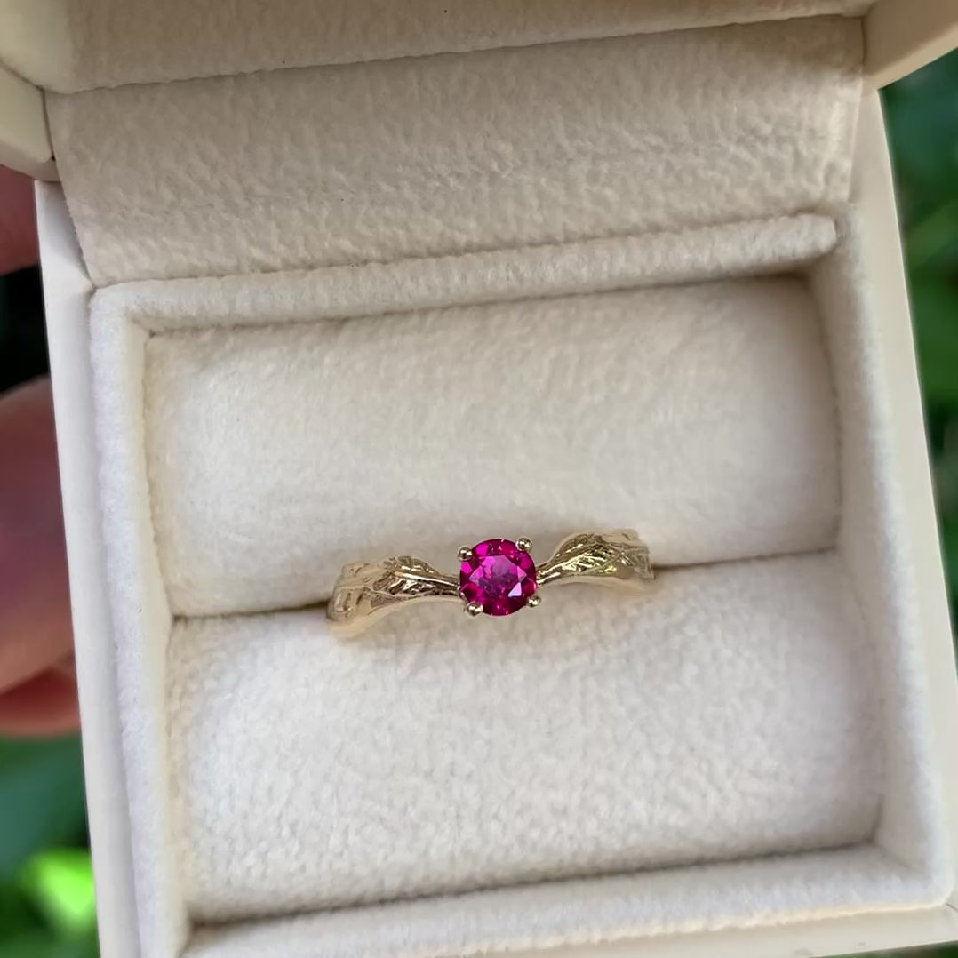 Infused with the fiery glow of a lab-created ruby, this enchanting ring is a celebration of love, artistry, and the natural world. Delicate hand-carved leaves unfurl across a sculpted gold band, cradling a vivid 4mm round lab created ruby at its heart—a gemstone long associated with passion, strength, and eternal devotion.